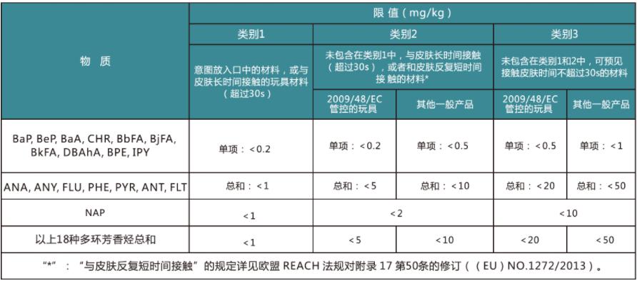 PAHs測試項目有18種化合物,分別為:萘、苊烯、苊、芴、菲、蒽、熒蒽、芘、苯並(a)蒽、屈、苯並(b)熒蒽、苯並(k)熒蒽、苯並(a)芘、茚並(1,2,3-cd)芘、二苯並(a,h)蒽和苯並(g,h,i)苝、1-甲基奈、2-甲基奈。PAHs測試限值要求如下: