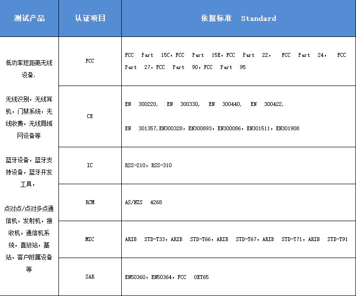 聯認檢測射頻實驗室具備先進、齊全的無線測試設備,並全部選用德國R&S、美國Aeroflex、日本ESPEC等國際知名廠商射頻儀器;同時,聯認檢測輻射場地、傳導場地嚴格按照CISPR16與ANSI C63.4設計與運作,取得FCC,IC,VCCI場地注冊認可資質;為產品射頻檢測測試數據準確性、穩定性提供有力的雙重保障。