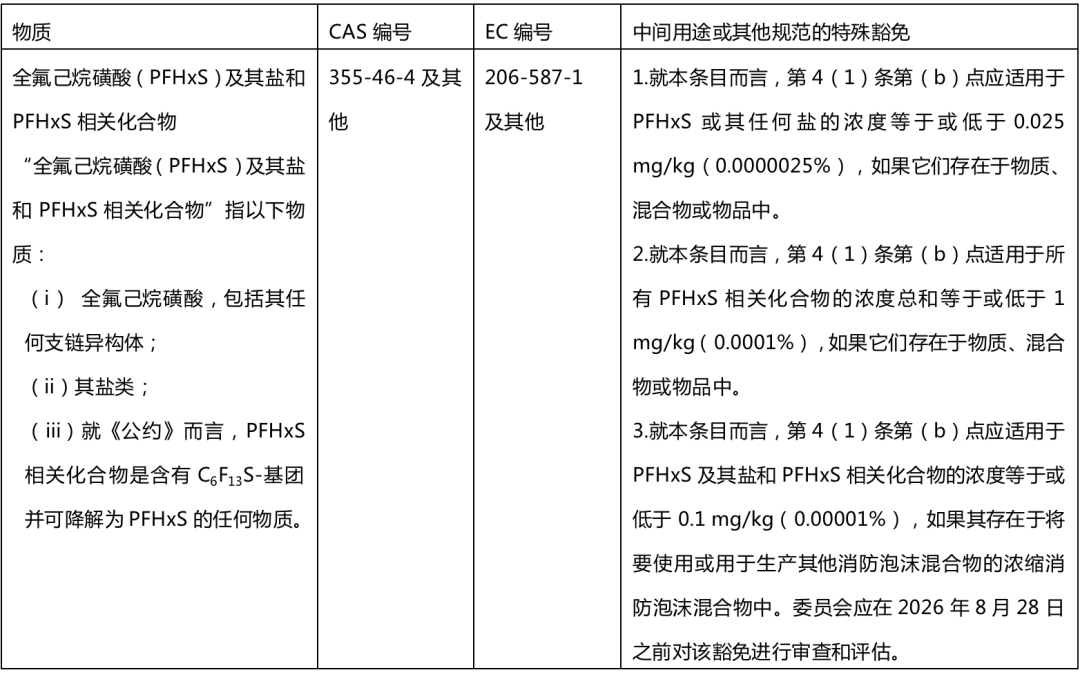 2023年8月8日,歐盟委員會在其官方公報上發布歐盟POPs法規(EU)2019/1021的修訂法規(EU)2023/1608,正式將PFHxS及其鹽和相關物質列入歐盟POPs法規附件Ⅰ禁用物質清單,本條例將於官方公報發布後的第20天起生效。至此,歐盟POPs法規附件Ⅰ禁用物質清單由28項增加至29項。
